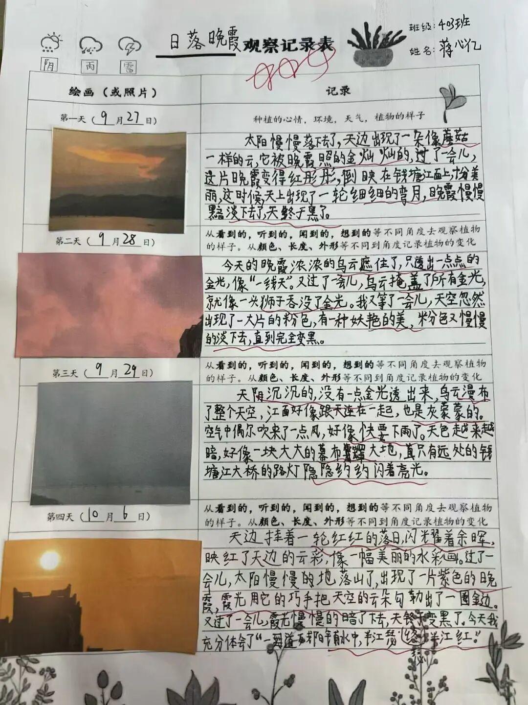 不过在布置作业时,很多老师的要求不仅限于绿豆,学生也可以观察其他的植物,或者一周的天气变化,小动物的成长变化等等。比如在朴老师班上,有的孩子到云南大理旅游,记录了大理的天气变化,有的没出门,就记录了国庆期间钱塘江潮水的变化。家长和孩子可以根据自身情况灵活选择。
