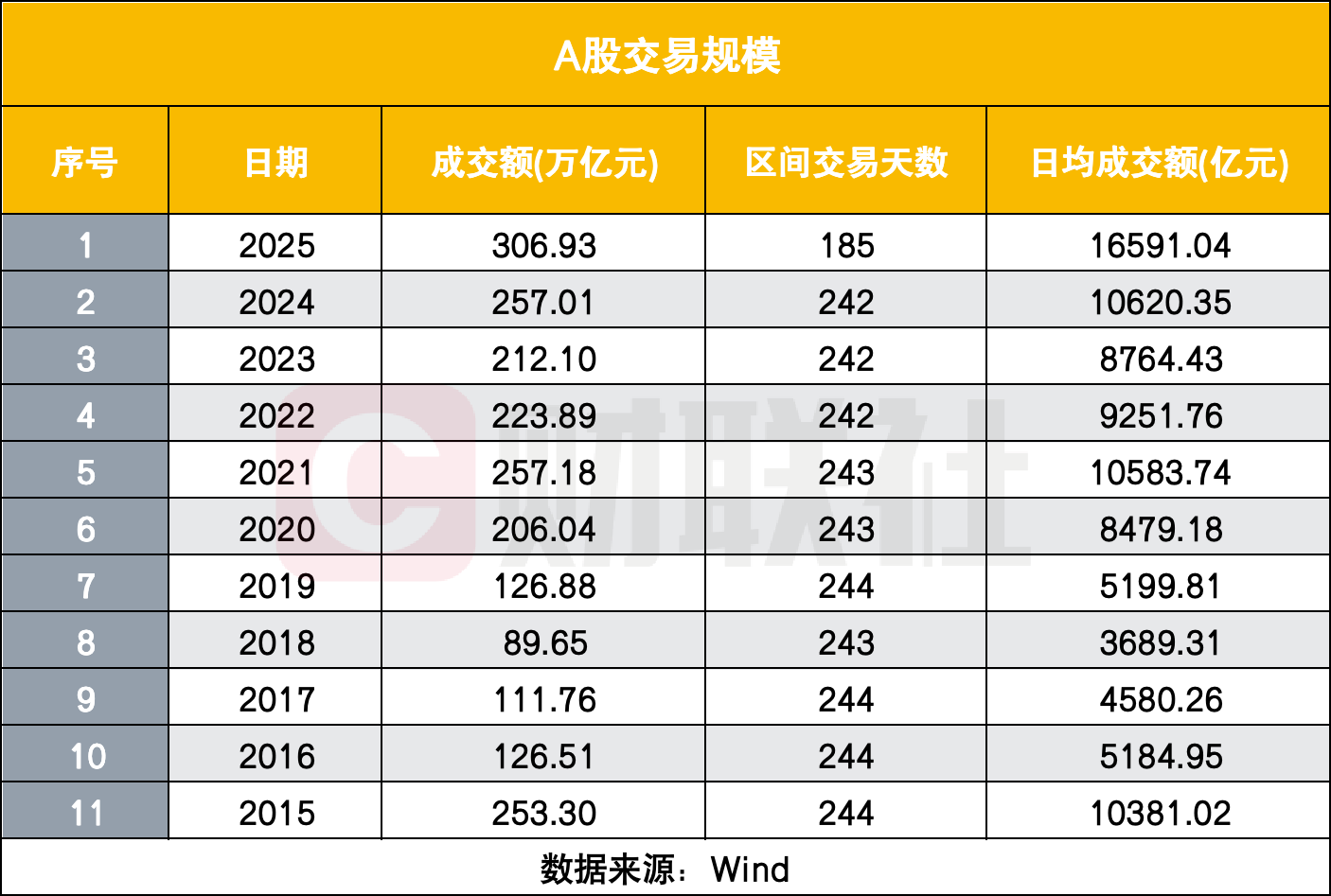 伴随市场规模扩大的,是A股交易活跃度的显著提升。数据显示,2025年截至10月9日收盘,A股年内成交额已达307万亿元,这一数值已超过2015年全年253万亿元的成交额,相当于2015年全年成交额的121%。