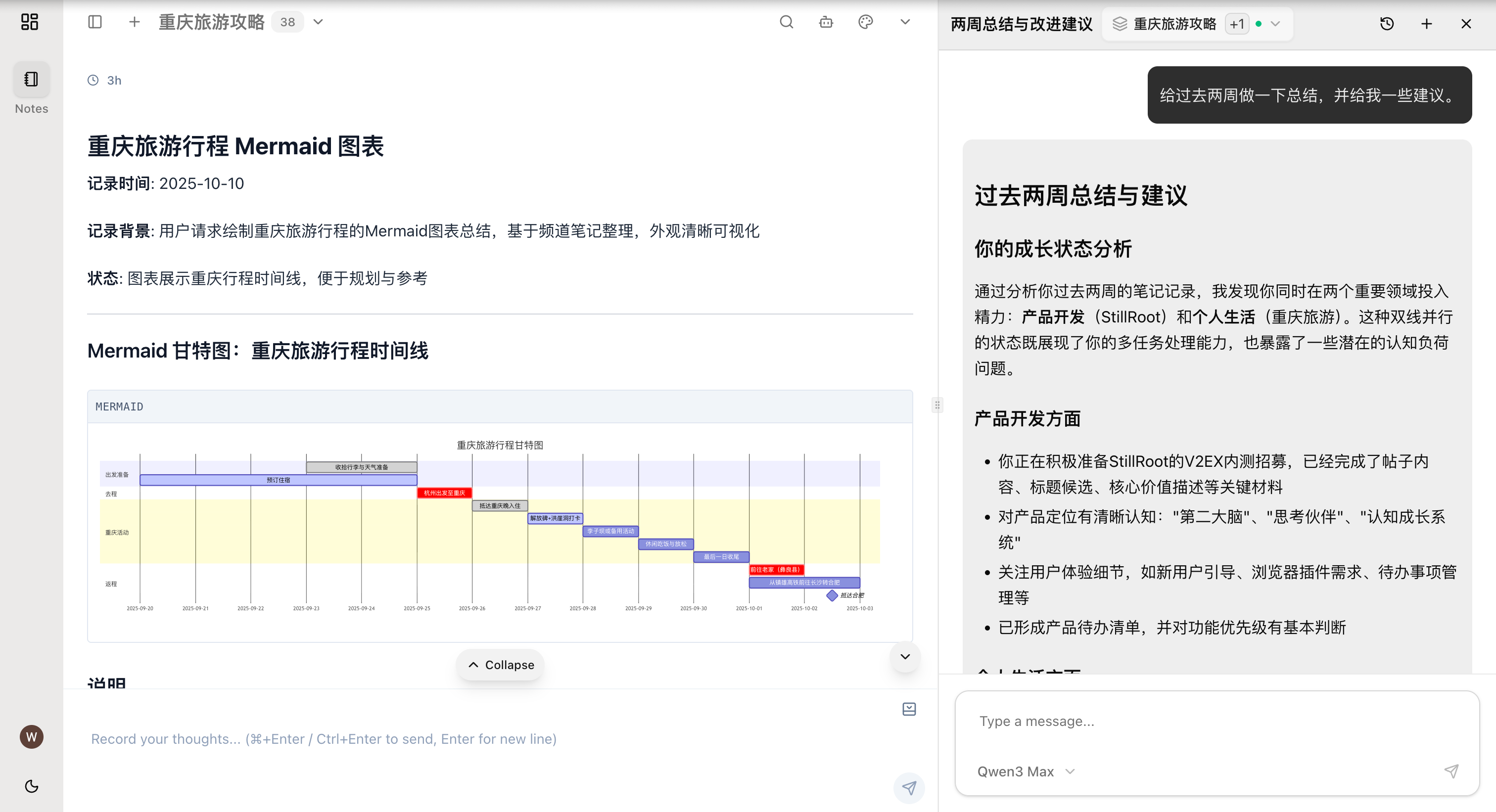 所以,我开发了 StillRoot——一个能把这些碎片想法和 AI 对话都沉淀下来的笔记工具,让 AI 能真正基于你自己的思考,帮助你把问题想得更深、更透。