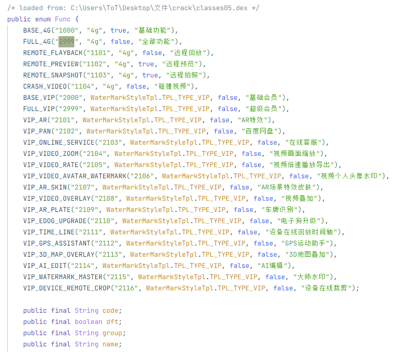 搜索 func 关键词,定位到枚举类,明确了功能权限的具体定义: