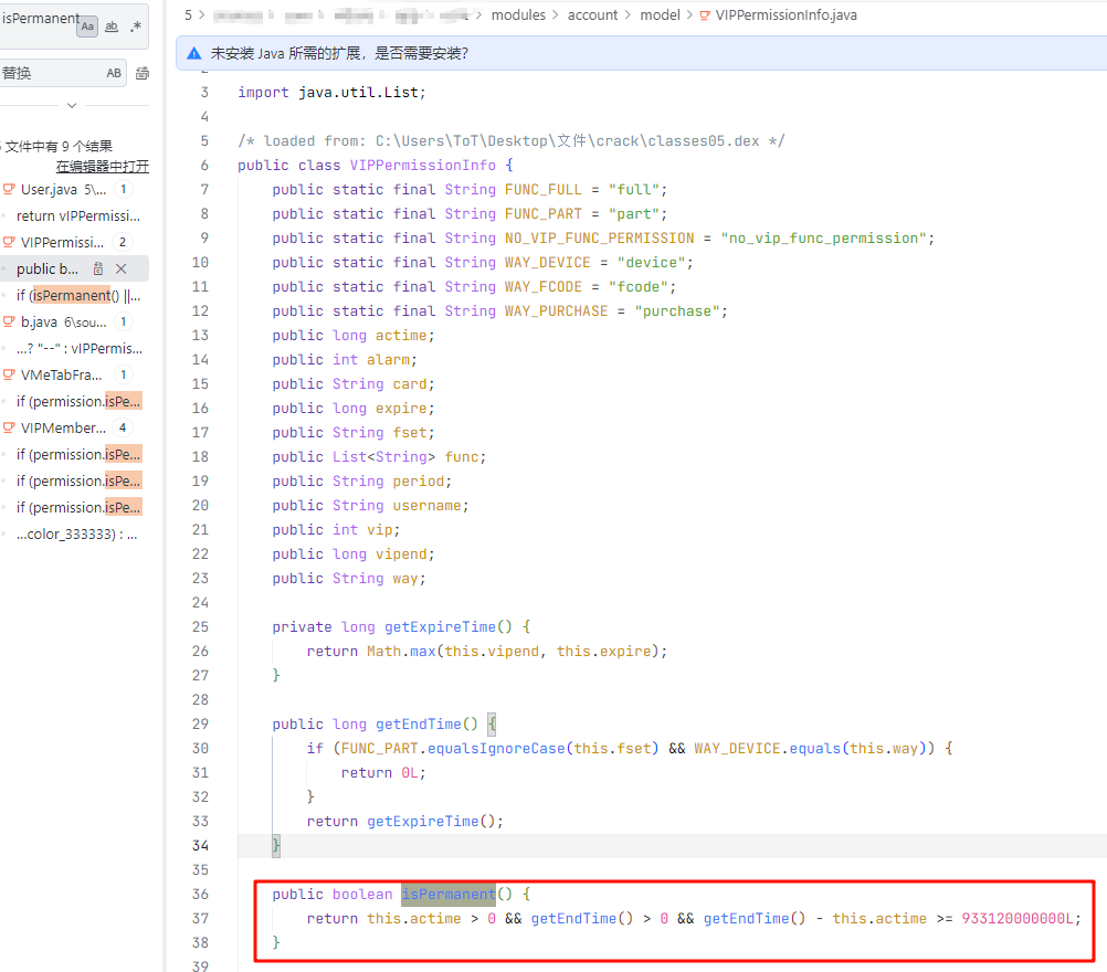 搜索会员相关关键词,发现 isPermanent 方法是判断会员状态的关键: