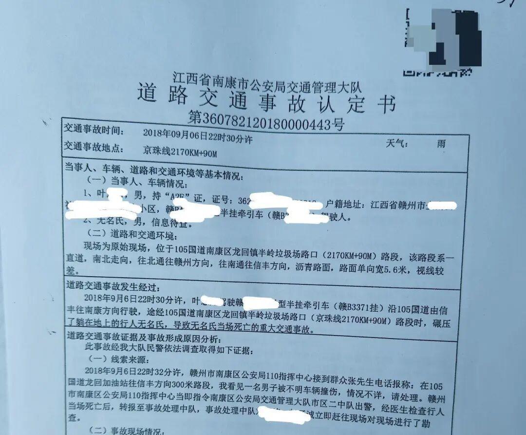在家属提供的道路交通事故认定书上,极目新闻记者注意到,江西省南康区公安局交通管理大队在事故发生经过中写道:“2018年9月6日22点30分许,叶某某驾驶一辆重型半挂牵引车,沿105国道由信丰往南康方向行驶,途经105国道南康区回龙镇半岭垃圾场路口路段时,碾压了躺在地上的行人无名氏,导致无名氏当场死亡的重大交通事故。”事故认定书上还写到,当事人叶某某驾驶机动车上路行驶,未确保安全,未保持安全车速,其行为违反了相关法律规定,是引发本起交通事故的主要原因,应承担主要责任;当事人无名氏在夜间且车流较大的车行道内坐卧、停留,是引发此次交通事故的次要原因,应承担次要责任。