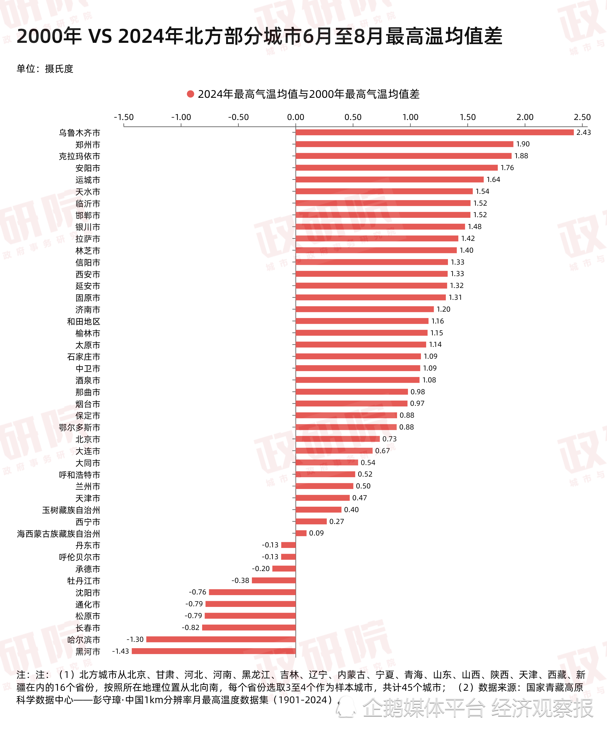 通过对2024年6月至8月与2000年同期的最高气温均值比较发现,约78%的北方城市呈现升温趋势,其中西北城市的升温变化更为显著。