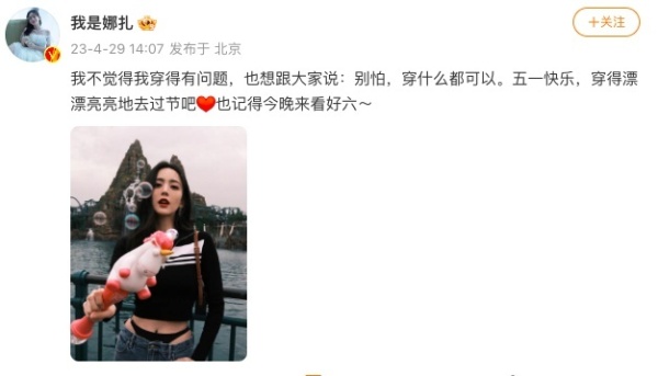 29日,娜扎对此发文回应:“我不觉得我穿得有问题,也想跟大家说:别怕,穿什么都可以。五一快乐,穿得漂漂亮亮地去过节吧。”