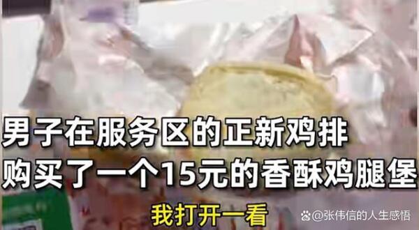 据报道,当时该男子在路上需要休息,便决定在服务区内的正新鸡排店购买一份快餐。他点了一份15元的香酥鸡腿堡,等待了一段时间后拿到了包装并付款离开。然而,当他打开包装后却震惊地发现里面只有两片面包,而没有任何鸡肉。他赶紧找到店主反映情况,希望能够得到解决。可是,店主并没有给予合理的回复,反而嘲讽道:“就是面包!”