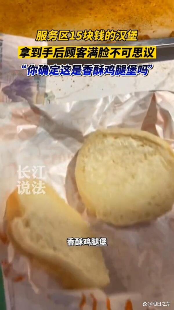 29日,山东德州。男子在一服务区正新鸡排店花15块钱买的香酥鸡腿堡,打开一看只有两片面包没有肉,找到老板反映情况,老板回复:“就是面包!”