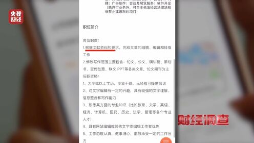 近期总台《财经调查》栏目接到群众反映,有个别企业,公开大肆招聘所谓“撰稿”人员,为有需求的群体有偿代写。只要付费,就能批量生产假文章、假论文,甚至形成了一条灰色生意链条。