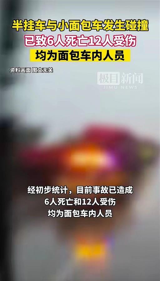 据新华社消息,4月29日上午,甘肃省酒泉市金塔县境内S228线航天村6组林场路段,一辆山西牌照的重型半挂车和一辆甘肃省张掖市牌照的小型面包车发生碰撞。经初步统计,目前事故已造成6人死亡和12人受伤,均为面包车内人员。
