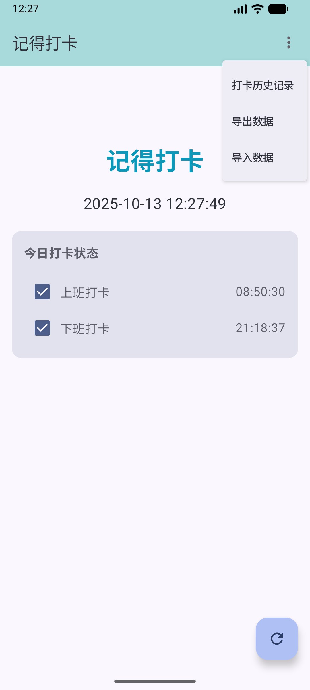 一个简洁易用的打卡考勤记录应用,用于记录工作时间,以及统计工作与加班情况。一直忘记打卡,肉疼,于是配合手机自动任务的地理围栏,写了这个程序,到办公室了就提醒我去打卡,还能顺便记录工作时间。作为安卓纯新手,此前在 V2EX 提问过技术栈,感谢小伙伴们的回复,我才最终完整了现在的这个版本。之前使用 Java 在 Ubuntu server w/o GUI 写的,现在这个是用 Kotlin 在 Android Studio 实现的。哦,对了,展示的数据都是我的真实上班时间。