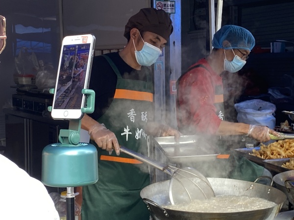 时代财经注意到,不少店铺门口还开起了带货直播,这头师傅掂着铁锅现场制作,那头主播和屏幕对面的“家人们”说道,“再不下单今天就要卖光了”。