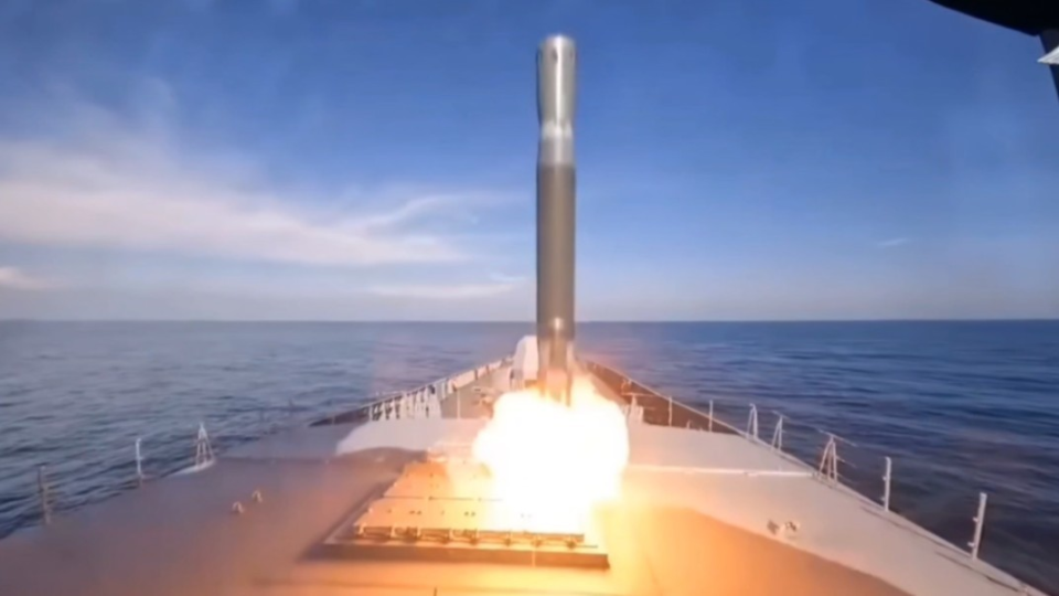 “锆石”导弹脱离护卫舰垂直发射装置瞬间。