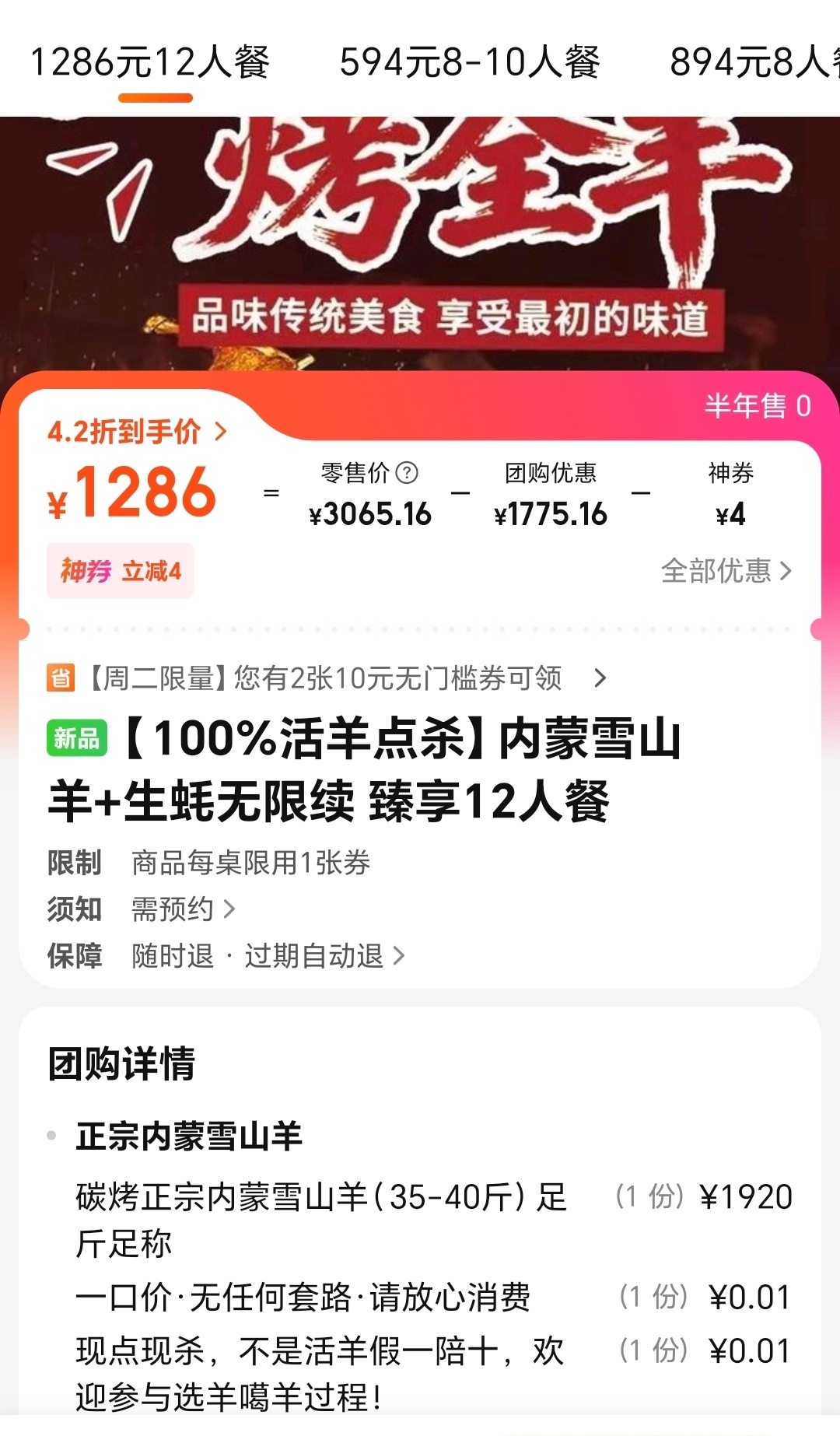 截至发稿,在某消费点评平台上,该店推出的团购套餐疑似有所调整。当前共有五种套餐,价格分别为594元、894元、1286元、2582元、3576元。其中接近博主所购的1286元套餐标注,“碳烤正宗内蒙雪山羊(35-40斤)”,并在菜品名称中额外标注“足斤足称”。