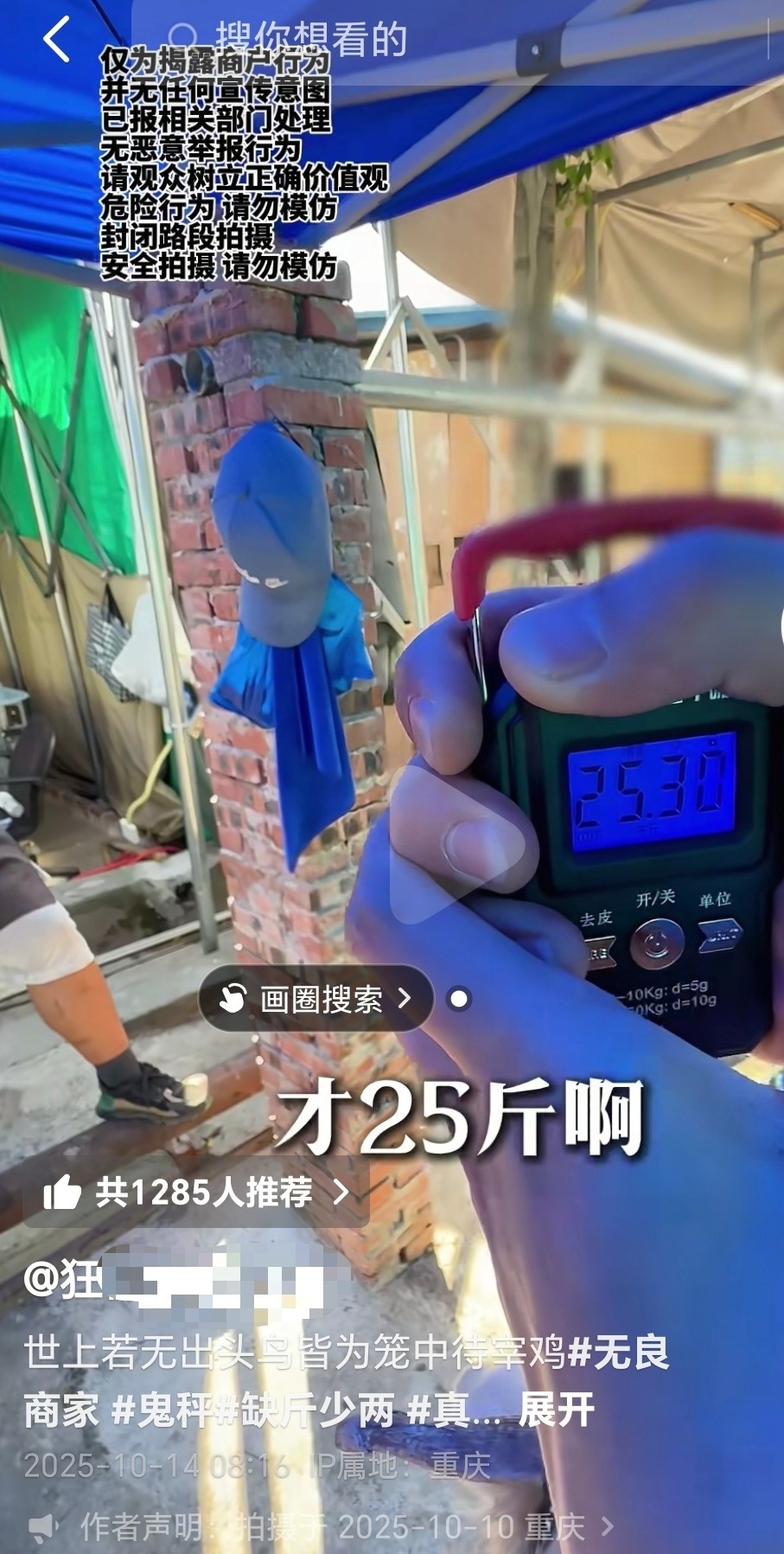 10月14日,一位探店博主在社交平台发短视频称,重庆渝北区某烤全羊店存在缺斤少两的情况。视频中,该博主作为消费者购买了五只宣称55-60斤的烤全羊。趁活羊未宰,博主用其自带的秤称量发现,其中最大一只34斤,最小一只25斤左右。