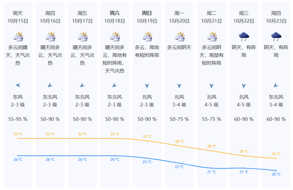 广东省气象台预计,15-16日,粤西和粤北市县多云间阴天,有分散(雷)阵雨,其余市县多云,局部有(雷)阵雨。最高气温:粤西和粤北偏北市县29~32℃,其余大部市县32~35℃。