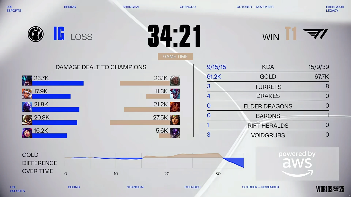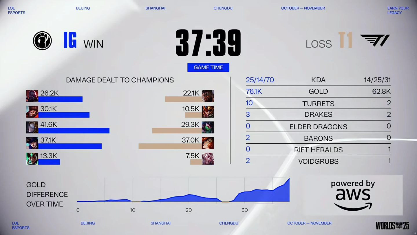 IT之家 10 月 14 日消息,在刚刚结束的 2025 (S15)《英雄联盟》全球总决赛入围赛对局中,来自 LCK 的卫冕冠军 T1 以 3:1 的比分战胜 LPL 战队 iG,晋级到明日开始的瑞士轮阶段中。