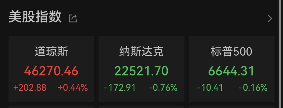 当地时间10月14日,美国三大股指收盘涨跌不一。Wind数据显示,截至收盘,道指涨0.44%,标普500指数跌0.16%,纳指跌0.76%。