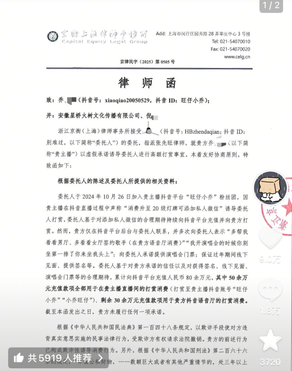 据悉,账号“别难过”以虚假承诺诱导高额打赏为由,向“旺仔小乔”发律师函,称要求其全额返还充值打赏款80万元,若律师函送达起5日之内不履行义务,将起诉“旺仔小乔”。