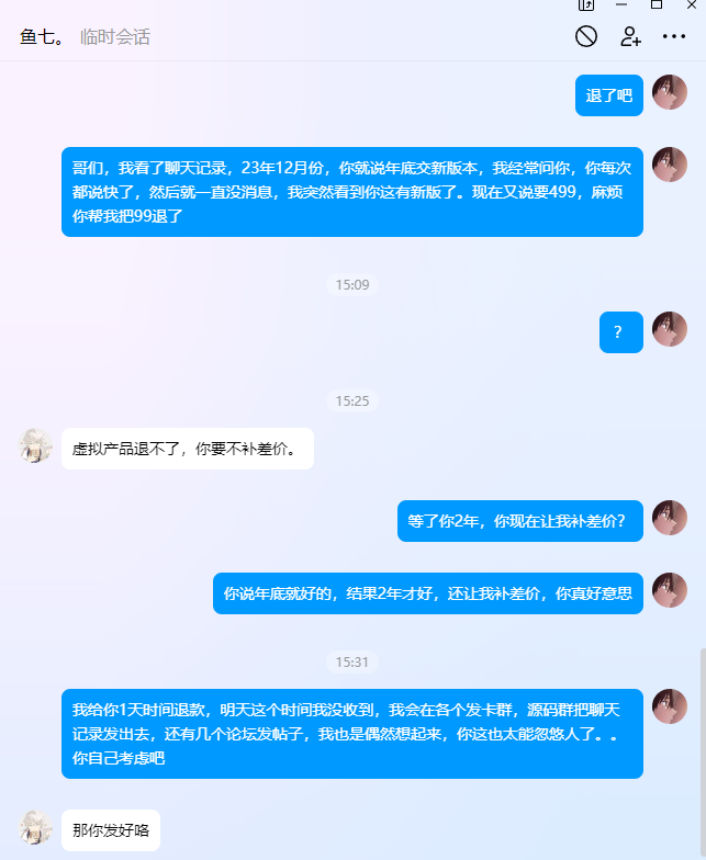 23年12月份发布群公告说要发布新版本99元低价促销,等了2年现在让我补400差价升级新版本。。。。