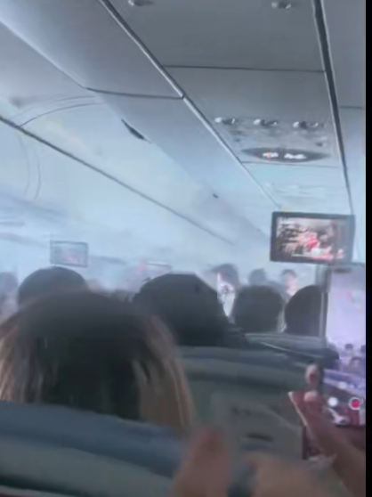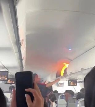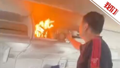 “本来还在飞机上啃面包,突然‘砰’一声就看到前面行李架火冒出来了。”搭乘该趟航班的网友发帖称,当时,整个客舱都是烟,行李架都熏黑了。