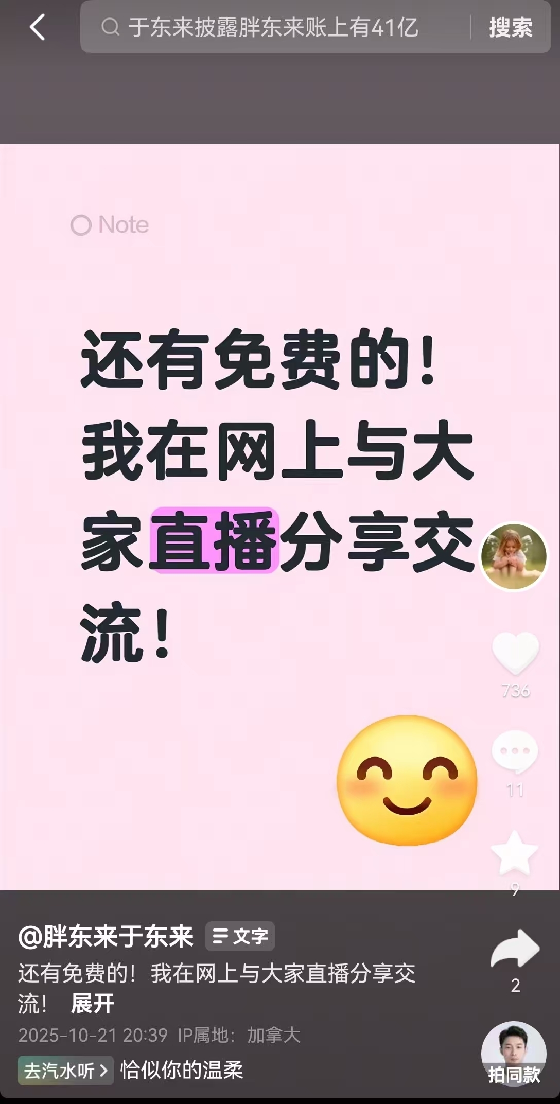 10月21日,于东来在社媒连续发文。于东来称:“为了方便企业家学习、正在规划方案!哪个企业家想让我个人直接分享交流、时间安排三个小时左右、每次五十万元费用!每月最多一次!费用全部用于传播美好之路!”