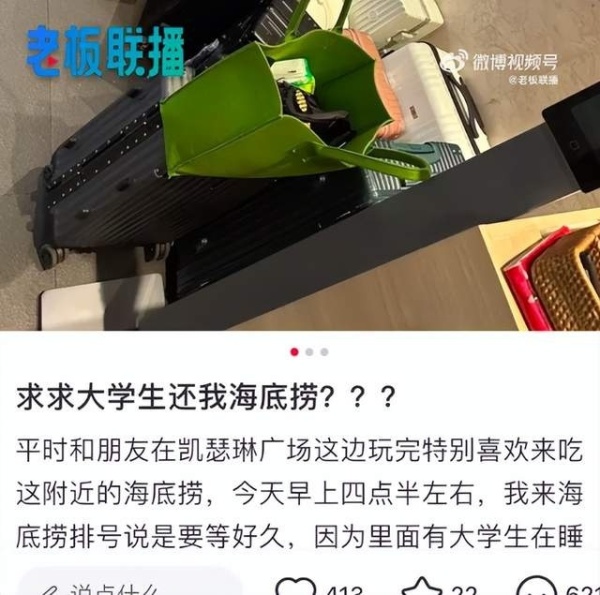 据经济观察报援引“老板联播”报道,4月29日,有网友在社交媒体发文称,当天凌晨4点半,他前往南京海底捞某门店吃饭,结果因为夜宿大学生太多需要排很久的队,和店里理论很久,也没吃上。