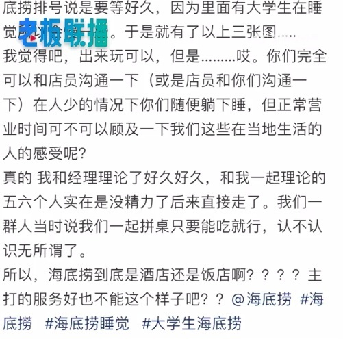 店长还表示,以前很少有人会主动要求留宿海底捞,但前不久有留宿海底捞的话题上了微博热搜就有了一些来店里休息的大学生群体。