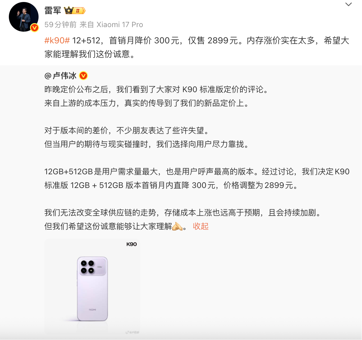 小米集团合伙人卢伟冰发文称,来自上游的成本压力,真实的传导到了新品定价上。12GB+512GB是用户需求量最大,也是用户呼声最高的版本。经过讨论,决定把K90标准版12GB+512GB版本首销月内直降300元,价格调整为2899元。