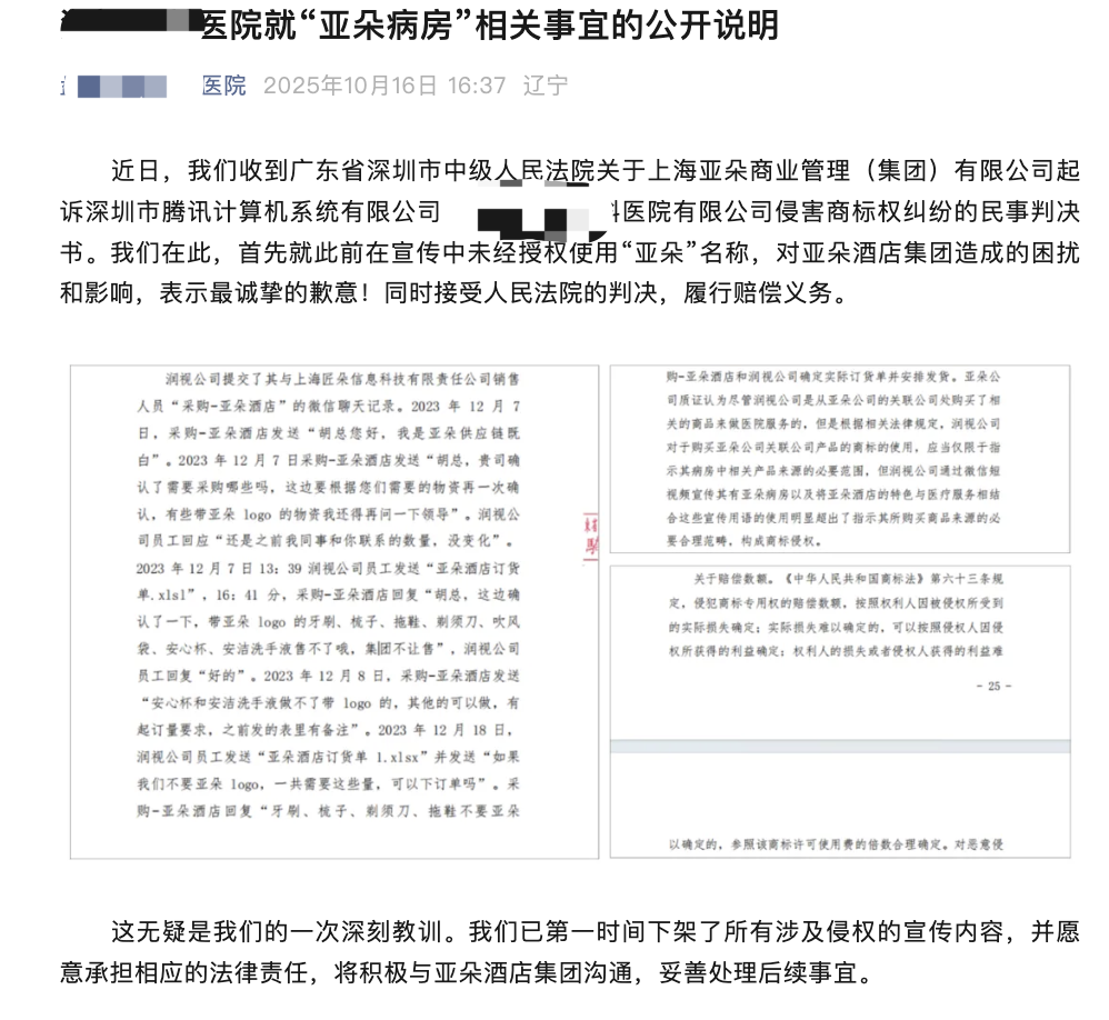 10月24日,上游新闻([email protected])记者查询该医院微信公众号发现,该医院于10月16日发布《关于“亚朵病房”相关事宜的公开说明》(以下称《公开说明》),表示已收到深圳市中级人民法院判决书,承认在宣传中未经授权的情况下使用“亚朵”商标,并已第一时间下架所有涉及侵权的宣传内容,接受判决并履行赔偿义务。医院在《公开说明》中解释称,设立“亚朵病房”初衷是为改善患者的住院体验,因医院团队成员在出差期间体验过亚朵的住宿。《公开说明》还提到:“判决书中所提及的‘亚朵病房’这一概念就是在这种情况下应运而生,我们开始着手打造这间特殊的病房。努力寻找与亚朵酒店相同标准的床品、卫浴用品和客耗品,希望为患者复刻一份熟悉的安心感。”但医院同时表示,“亚朵病房”本身与亚朵酒店官方无任何合作关联,在宣传过程中“忽略了商标保护的边界,犯了不该犯的错误。”