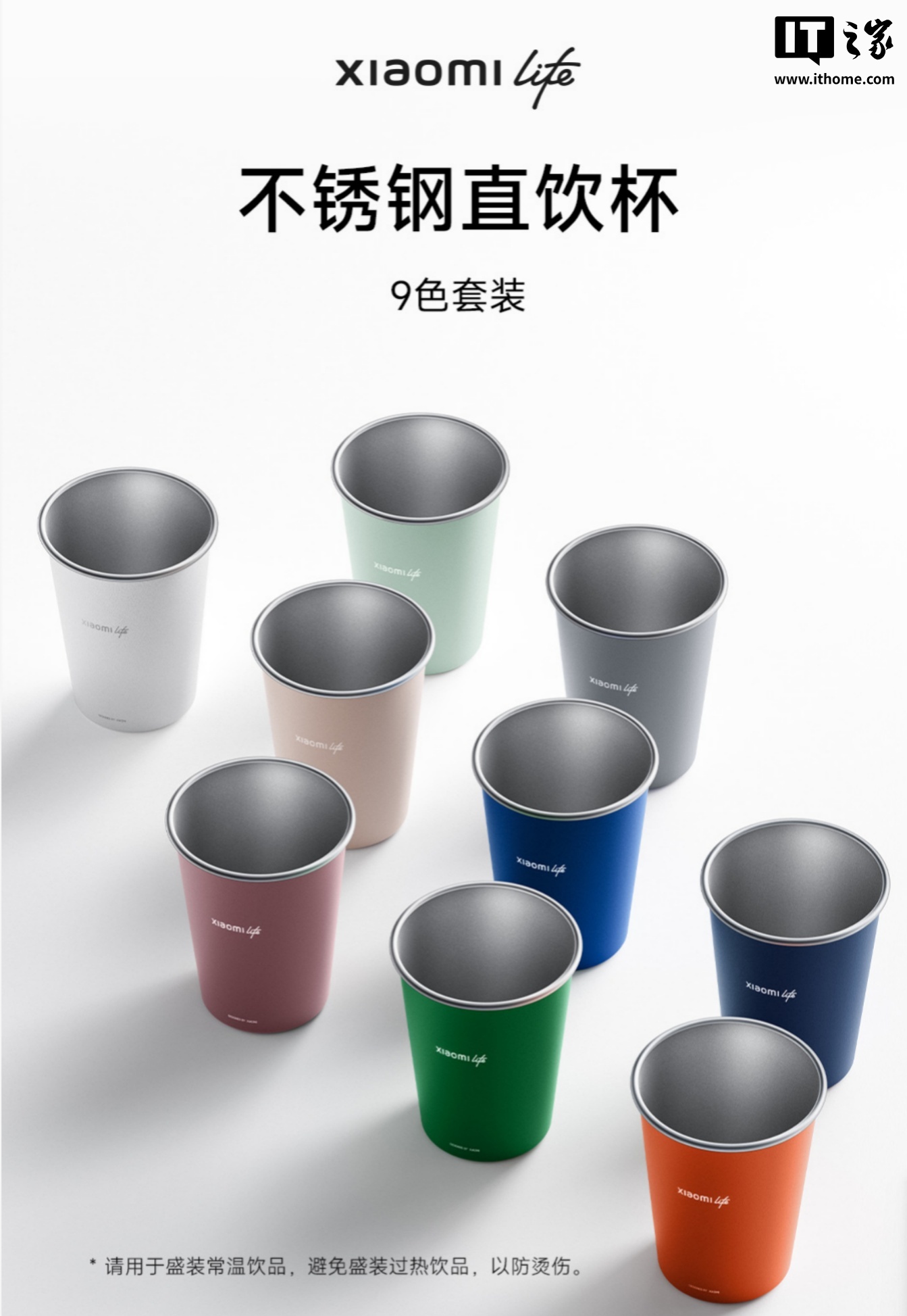 Xiaomi Life 不锈钢直饮杯 9 色套装采用小米 YU7 车身同款配色,350mL 容量、304 不锈钢材质。