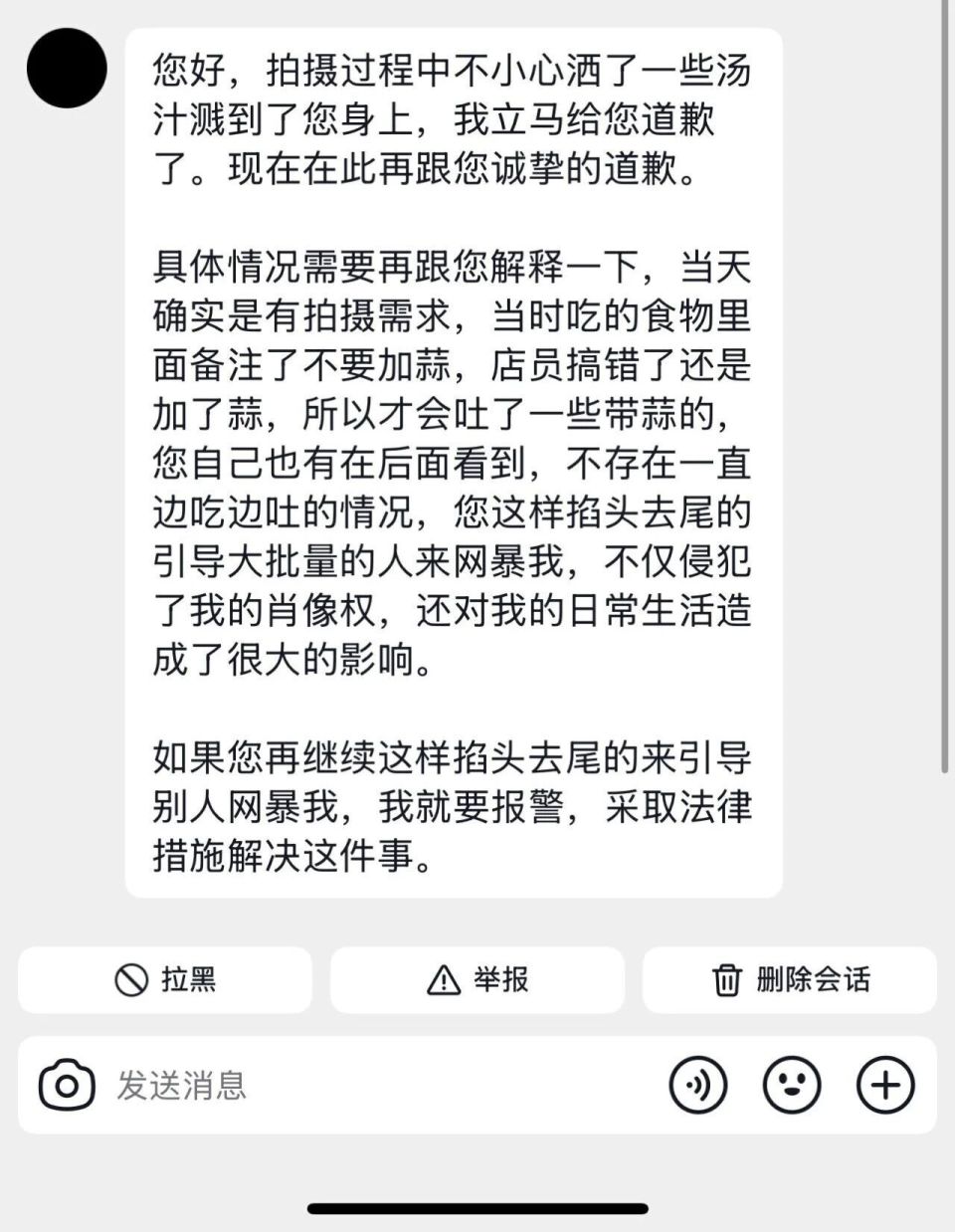 该博主于10月30日找到王先生,称当时吃的食物里带蒜,所以才会吐了一些带蒜的,不存在边吃边吐的情况,并称要采取法律措施解决这件事。