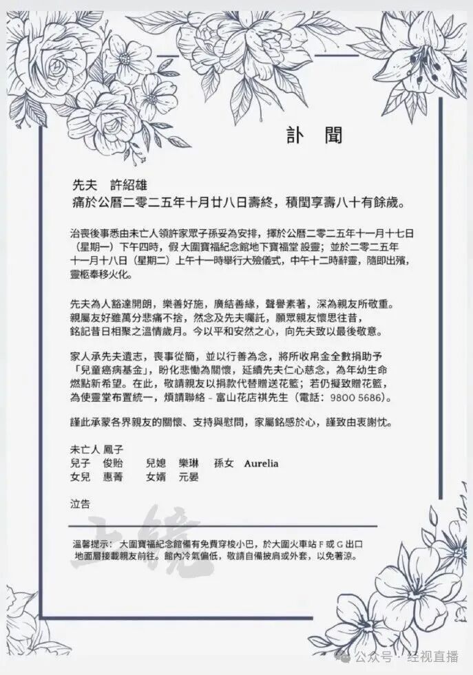 家人承先夫遗志,丧事从简,并以行善为念,将所收帛金全数捐助予「儿童癌病基金」,盼化悲恸为关怀,延续先夫仁心慈念,为年幼生命燃点新希望。谨此承蒙各界亲友的关怀、支持与慰问,家属铭感于心,谨致由衷谢忱。