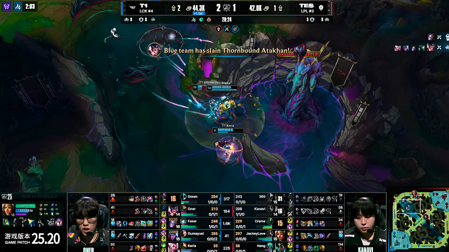 比赛14分钟阿水与Hang在中路将小吕布击杀,随后T1来到中路将阿水收掉,峡谷先锋被TES控下。17分钟小龙团,T1一波技能协同将阿水秒掉,小龙拼惩戒Oner拿到。20分钟T1果断的反手开团,小吕布卡莎安全输出直接砍下三杀,T1团灭TES拿下厄塔汗。