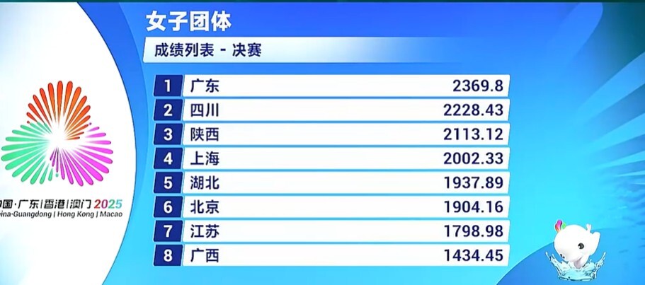 广东队以2369.8分成功实现卫冕,四川队2228.43分获得银牌,陕西队2113.12分获得铜牌,排名4到8位的分别是上海队、湖北队、北京队、江苏队和广西队。