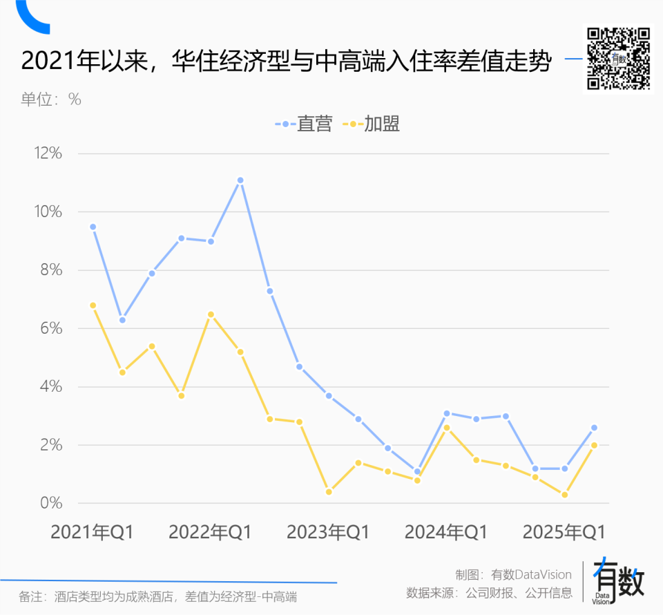 按照酒店集团财报,连锁品牌与加盟店相关的收入越来越多。加盟服务费与房价直接挂钩,在入住率接近的情况,扩张中高端酒店,也比经济型酒店获利更多。