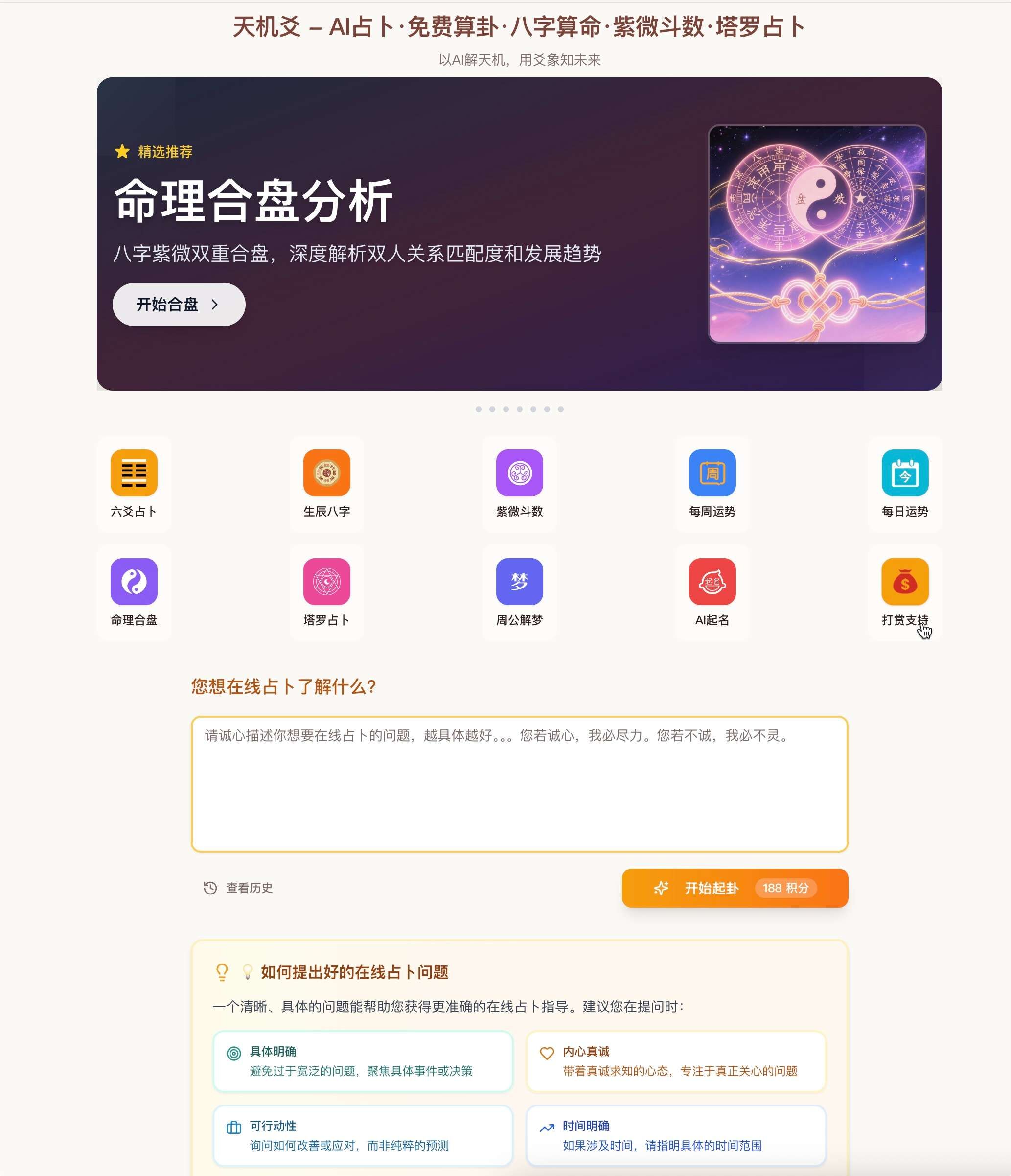 它是一个把 八字、紫微斗数、塔罗、六爻、梦境解析 这些传统占卜系统,全都接入 AI 引擎的在线占卜网站。