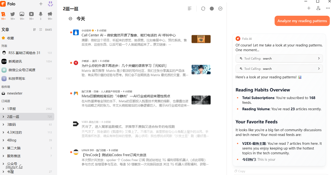 还有人在用 folo 吗 怎么今天一打开界面变成了这样 右边这个 AI 窗口管不了,文章列表还无法跟正文共存的。。。 我找了半天没看到在哪里关了左边 chat 的界面。。。。很影响使用 Folo, 界面, AI