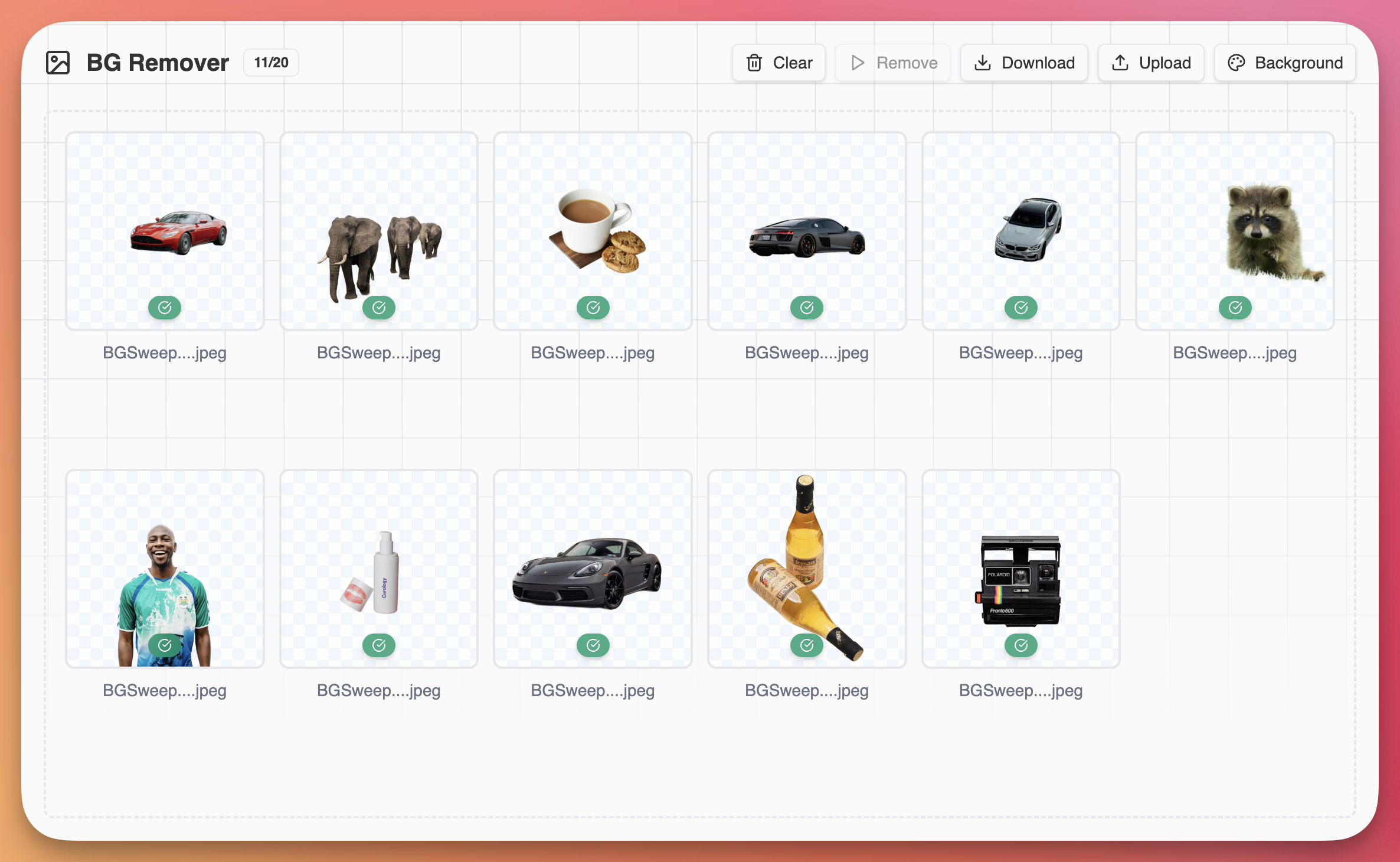 项目介绍 一款完全免费的批量背景去除工具,一次最多可以处理 20 张图片。现有部分产品仅支持单次单张图片处理,如果有多张图片,操作起来比较麻烦。所以我做了批量处理的功能,限制在 20 张是为了减小服务器压力,提高成功率。抠图效果还不错,对比了 Apple 、PowerPoint 自带的抠图工具,效果更好。和付费工具 Remove.bg 对比,效果差不多,在部分情况下甚至更好一些。支持高分辨率输出,不会压缩原图的分辨率。如果有高分辨率的图片,不用担心处理后会变模糊的问题。模型处理图片的速度和分辨率及图像复杂程度相关。如果想获得更好的效果,可以使用背景简单一些的图片。分辨率低的图片处理速度更快,合理分辨率的图片处理效率更高。图片处理后即刻删除,不会存储在服务器,保护用户的隐私。不需要登陆,点开网站就可以使用。可以自定义抠图后的图片是采用透明背景或者单色的背景,目前提供 9 种颜色的选项。为什么免费?因为这个模型不大,处理效率高,单张成本低,但效果还是很不错的。部署在 GPU 上的成本不高,所以设置为免费。可用于商业目的,但是请注意原图片的版权归属。 网站 https://bgsweep.com/ https://bgsweep.com/zh 产品图片