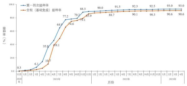 截至2023年4月27日,31个省(自治区、直辖市)和新疆生产建设兵团累计报告接种新冠病毒疫苗349474.0万剂次(图5-1)。接种总人数131048.9万人,完成全程接种127710.0万人,完成第一剂次加强免疫接种82790.4万人。全人群第一剂次、全程接种覆盖比例分别达到93.0%和90.6%(图5-2)。60岁以上老年人累计报告接种新冠病毒疫苗68096.9万剂次,接种总人数24169.6万人,完成全程接种23037.2万人,完成第一剂次加强免疫接种19322.2万人。