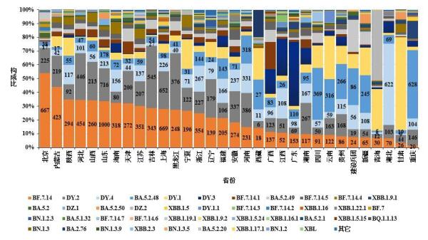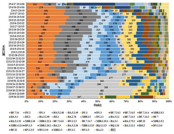 2.图中标记的数字按顺序分别为BF.7.14、DY.2、DY.4、BA.5.2.48、BA.5.2.49和DY.1进化分支有效基因组序列数量;