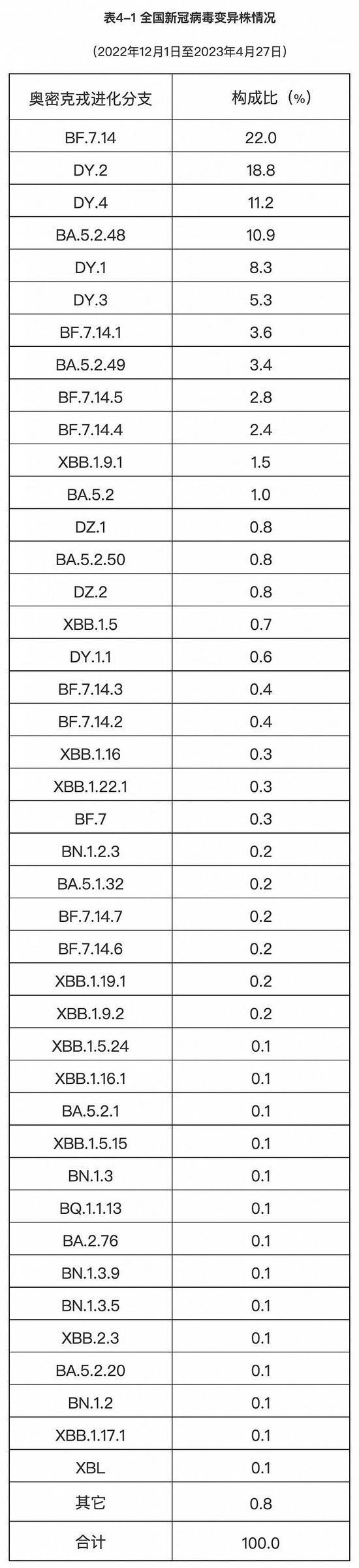 (二)12月以来本土病例病毒变异株监测情况。2022年12月1日至2023年4月27日,全国共报送35089例本土病例新冠病毒基因组有效序列,均为奥密克戎变异株,涵盖134个进化分支。主要流行株为BA.5.2及其亚分支(构成比62.2%)和BF.7及其亚分支(构成比32.3%)等。其中,BA.5.2及其亚分支包括DY.2(18.8%)、DY.4(11.2%)、BA.5.2.48(10.9%)、DY.1(8.3%)、DY.3(5.3%)和BA.5.2.49(3.4%)等;BF.7及其亚分支包括BF.7.14(22.0%)、BF.7.14.1(3.6%)、BF.7.14.5(2.8%)、BF.7.14.4(2.4%)、BF.7.14.3(0.4%)和BF.7.14.2(0.4%)等(表4-1)。共监测到本土重点关注变异株1527例,其中,4例BQ.1、5例BQ.1.1、34例BQ.1.1.13、1例BQ.1.1.17、1例BQ.1.1.18、1例BQ.1.1.35、1例BQ.1.1.38、1例BQ.1.1.46、1例BQ.1.1.53、2例BQ.1.1.66、1例BQ.1.1.69、8例BQ.1.2、1例BQ.1.23、2例BQ.1.8、2例CH.1.1、6例CH.1.1.1、1例CH.1.1.11、2例CH.1.1.17、1例DT.2、1例EA.1、4例EG.1、3例EL.1、7例EM.1、1例ET.1、10例EU.1.1、3例FB.1、1例FD.2、6例FE.1、7例XBB、6例XBB.1、5例XBB.1.11.1、1例XBB.1.12、13例XBB.1.15、116例XBB.1.16、43例XBB.1.16.1、21例XBB.1.17.1、1例XBB.1.19、70例XBB.1.19.1、5例XBB.1.22、103例XBB.1.22.1、2例XBB.1.22.2、1例XBB.1.23、10例XBB.1.24、1例XBB.1.4、248例XBB.1.5、1例XBB.1.5.1、6例XBB.1.5.11、16例XBB.1.5.12、1例XBB.1.5.13、35例XBB.1.5.15、2例XBB.1.5.16、2例XBB.1.5.17、1例XBB.1.5.2、1例XBB.1.5.20、1例XBB.1.5.21、8例XBB.1.5.23、51例XBB.1.5.24、1例XBB.1.5.28、2例XBB.1.5.32、5例XBB.1.5.35、2例XBB.1.5.36、1例XBB.1.5.5、3例XBB.1.5.7、2例XBB.1.9、540例XBB.1.9.1、53例XBB.1.9.2、1例XBB.1.9.3、1例XBB.1.9.5、23例XBB.2.3、1例XBB.2.3.2、1例XBB.2.4、2例XBB.3。