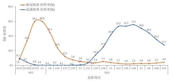 图2-5 全国哨点医院流感样病例新冠和流感病毒阳性率变化趋势