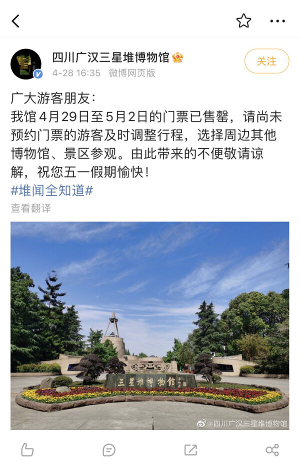 4月28日下午,四川广汉三星堆博物馆消息,该馆4月29日至5月2日的门票已售罄。请尚未预约门票的游客及时调整行程,选择周边其他博物馆、景区参观。