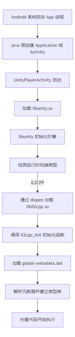 要直到如何保护libil2cpp.so首先需要知道这个so文件是在什么时候被载入的,根据il2cpp安卓端的启动流程,我们可以发现载入位置,其流程图如下: