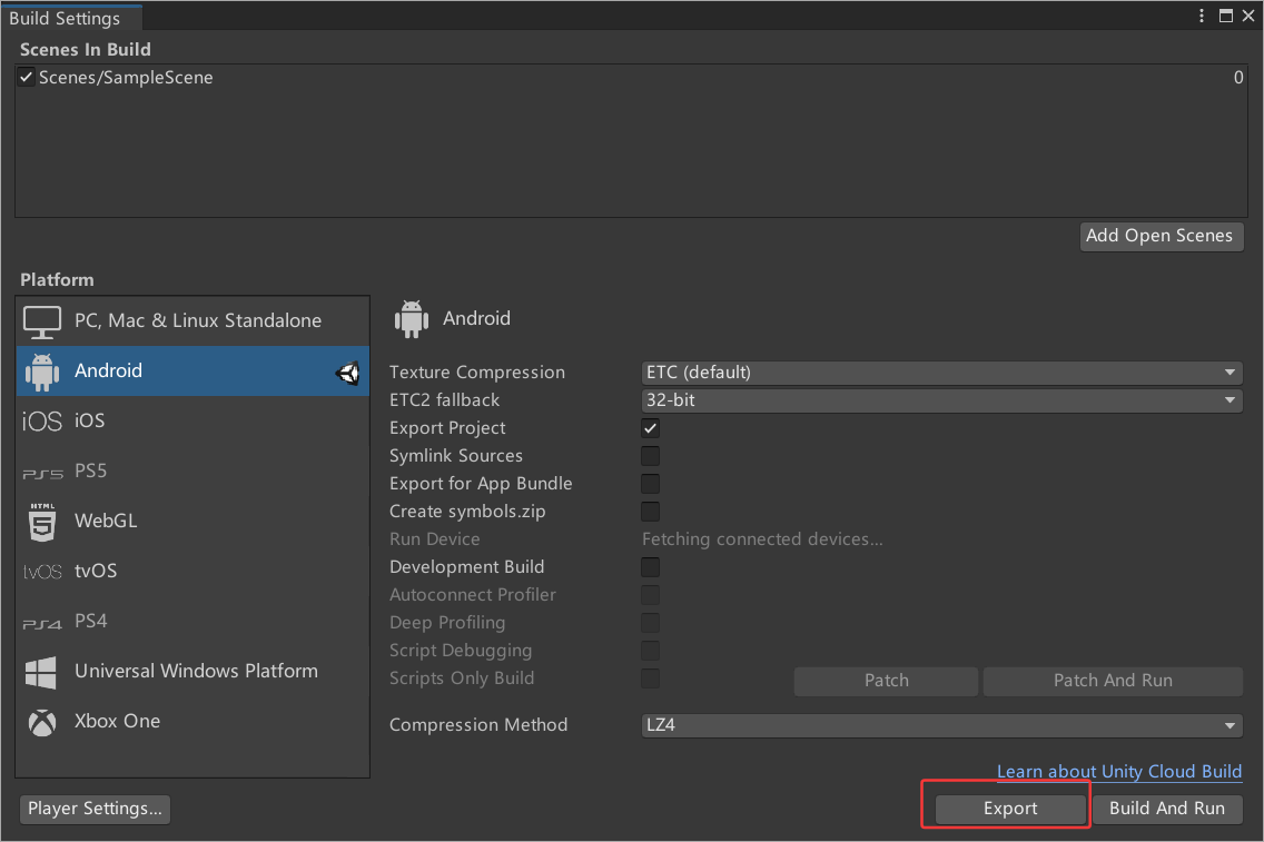 导出项目在装好安卓的SDK之后,Build Setting界面,直接就可以看到导出了。