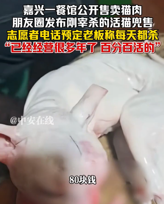 11 月 3 日报道,浙江嘉兴。近日有网友曝光嘉兴某餐馆通过朋友圈发布活猫宰杀视频及兜售信息,声称提供现宰猫肉,单价约 20 元 / 碗(供 2-3 人食用),并强调“百分百活猫现杀”。对话实录显示,顾客需提前预约,店家称“每天都杀”,并且声称“我们家是开了很多年的老店了,百分之百是活猫现杀”。