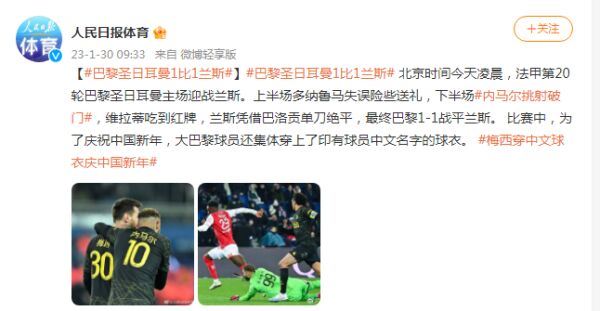 北京时间今天凌晨,法甲第20轮巴黎圣日耳曼主场迎战兰斯。上半场多纳鲁马失误险些送礼,下半场内马尔挑射破门,维拉蒂吃到红牌,兰斯凭借巴洛贡单刀绝平,最终巴黎1-1战平兰斯。比赛中,为了庆祝中国新年,大巴黎球员还集体穿上了印有球员中文名字的球衣。
