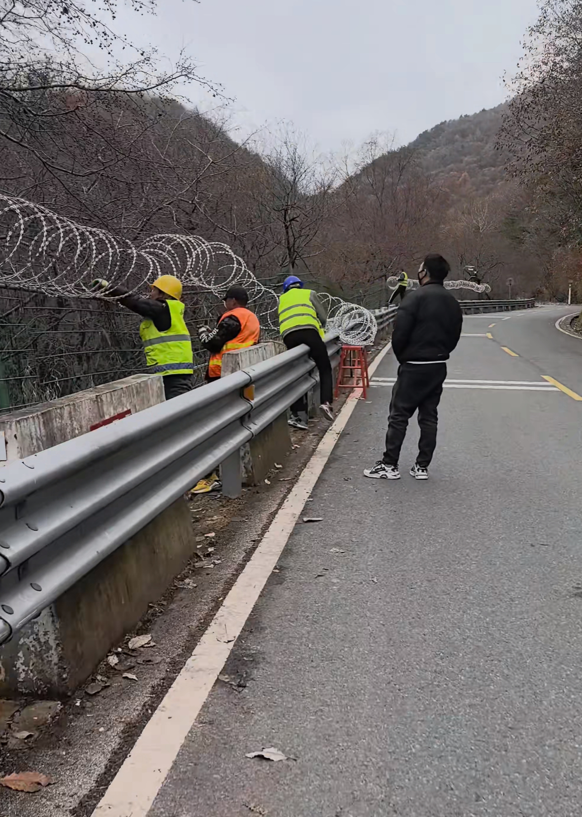 近日,有网友发布视频,在陕西西安长安区秦岭境内一条国道上,有身穿制服头盔的工作人员在路边的护栏上,疑似在加装带刺的铁丝环。