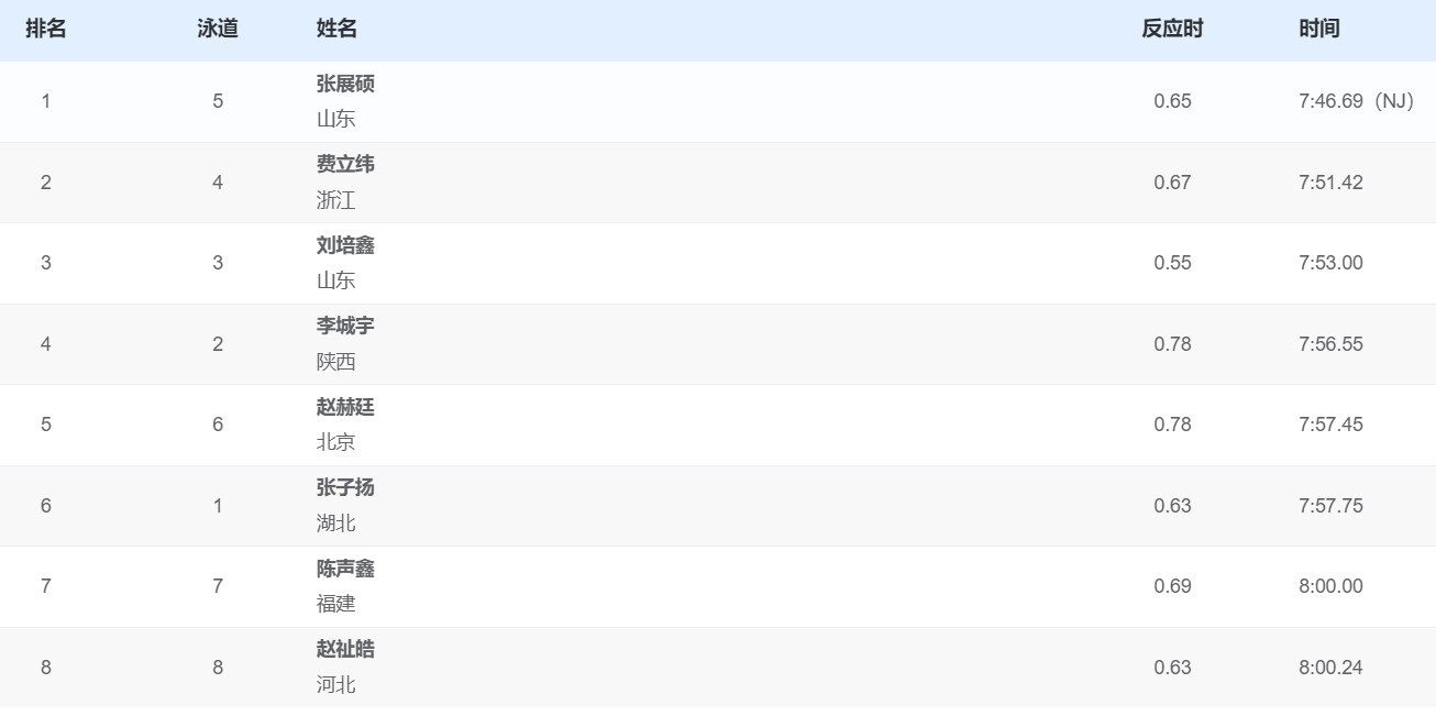 进入到700米,费立纬实现了对刘培鑫的超越,张展硕则继续保持在领游的位置。最后冲刺阶段,张展硕全力冲击,7分46秒69率先触壁完成比赛,创造了新的全国青年纪录。
