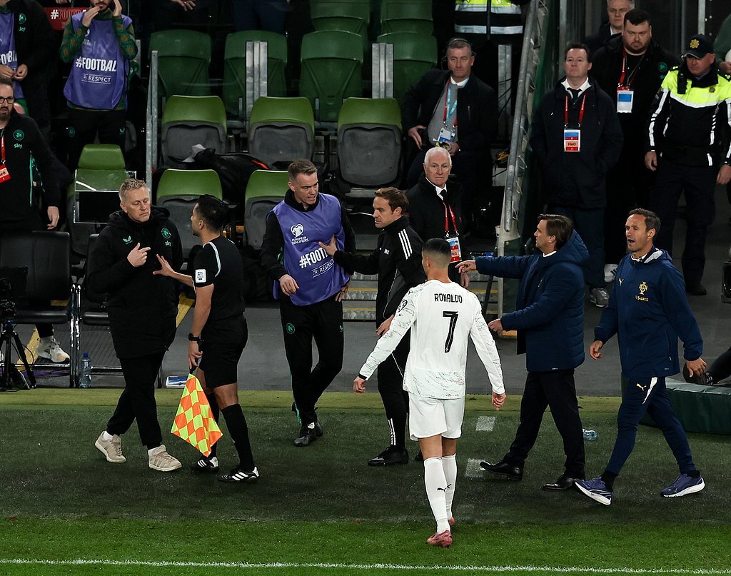 而C罗离场时依然不依不饶,他竖大拇指嘲讽主裁判罚,随后与爱尔兰主帅进行激烈交流,最终被葡萄牙助教卡瓦略劝回。