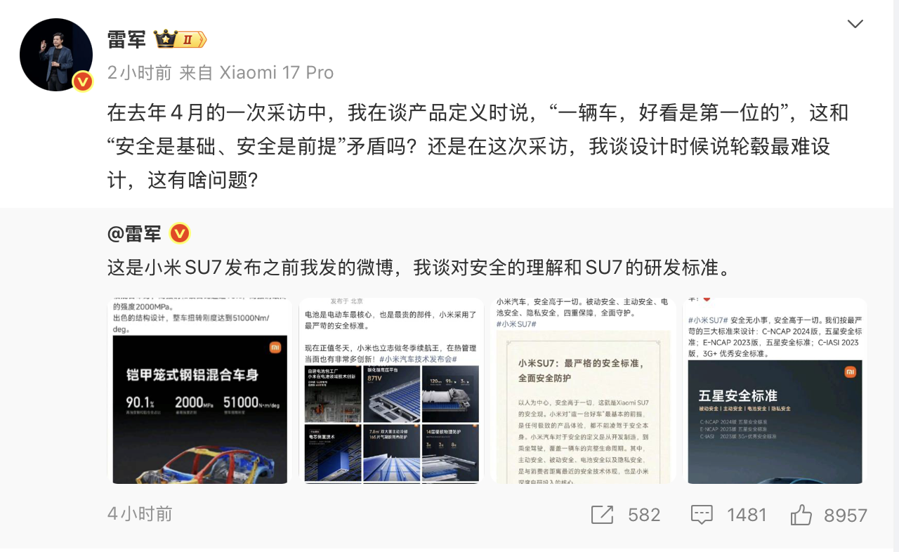 在微博中,附上他于2023年和2024年发布的四则微博截图,称“这是小米SU7发布之前我发的微博,我谈对安全的理解和SU7的研发标准。”